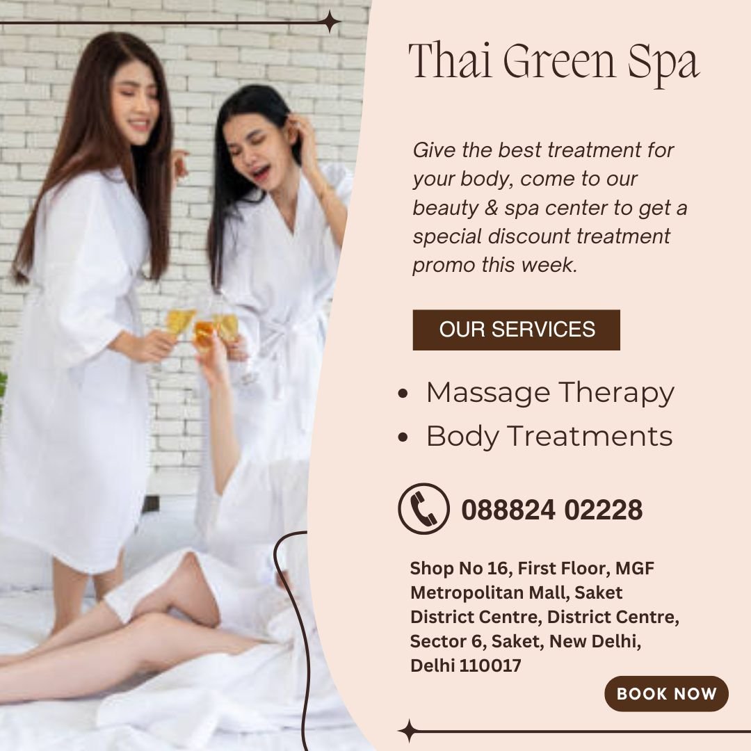 Rejuvenate your senses at Thai Green Spa – the best spa near Saket Metro Station & Malviya Nagar, Delhi. Experience certified therapists, luxury ambiance, and personalized treatments at affordable rates. Whether you're searching for a "spa near me" or the best spa in Saket or Malviya Nagar, our organic oils and relaxing therapies offer instant stress relief. Clean, hygienic, and serene – your ideal spa getaway in Delhi is just a step away. Book your healing session today!